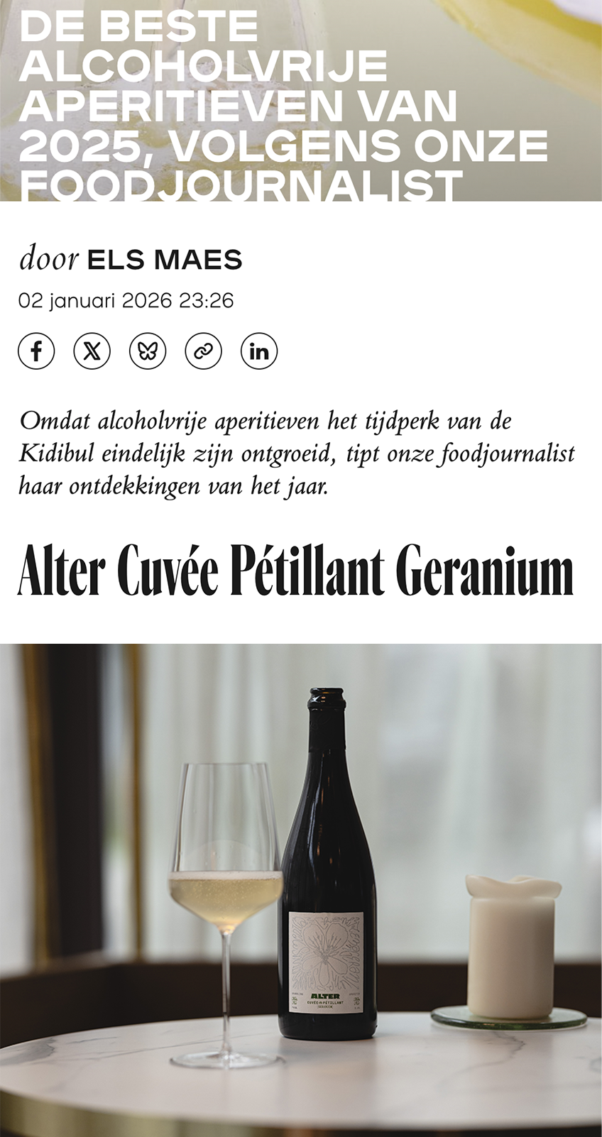 "Alter wil vooral een alternatief bieden dat eenzelfde gelaagdheid, structuur en afdronk biedt, maar doet dat niet door druiven te fermenteren, wel door originele en soms zotte experimenten (gedroogde schil van koffiebes, iemand?).